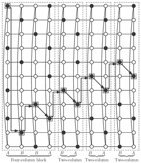 The desired independent -set S is obtained with one initial four-column block and attaching to it as many two-column blocks as necessary, to obtain the cylinder (note that ) (see Figure 11). Note that, although vertices in S in a two-column block are not a dominating set by themselves, as can be seen in Figure 10d, when we attach such a block to one four-column block following the rotation rules as described above, we obtain an independent -set S (see Figure 10e). After this first operation, adding a new two-column block keeps independent -domination (see Figure 11). We show in this figure the case , but the same pattern works with smaller cases and , and also with larger ones.