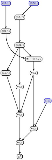 It is known (see for example []) that the irreducible components of a variety are closures of single orbits or closures of infinite families of orbits. Since there are no infinite families of 7-dimensional 2-step nilpotent Lie algebras, the irreducible components of  are the orbit closures of the rigid Lie algebras: if  is a rigid Lie algebra in , then there exists an irreducible component C of , such that  is open; then, . In the Hasse diagram, one can identify the rigid algebras as those that have no entering arrows. Another proof of this fact can be found in [].