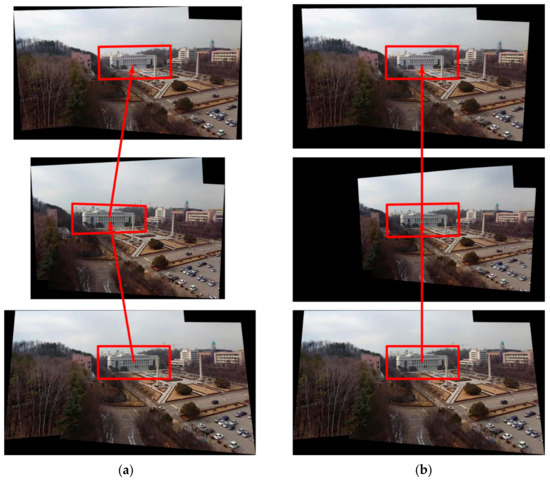 We will review prominent existing image stitching research. The outstanding issue of image stitching is how to remove the misalignments that are generated by parallaxes. Researchers have attempted various approaches to solve the problems mentioned above. The research has generally focused on two approaches: (1) seam-driven methods [13,14,15,16], and (2) warping methods [17,18,19,20]. First, seam-driven methods are techniques that find the optimal seam that separates two images to minimize the stitching errors. Many diverse methods to find the optimal seam have been studied. Agarwala [13] found the seam by using a graph-cut. Gao [14] selected the best seam among the seam candidates that are generated by various homographies. Zomet [15] proposed gradient domain image stitching (GIST), which minimizes the cost functions of the gradient domain. Lee [16] proposed the use of structure deformation using the histogram of gradient (HoG) along the seams. Second, warping methods are techniques that warp the images generated by multiple homographies instead of estimating a global homography. Gao [17] proposed a warping method using a dual-homography that is a combination of a distance plane and a ground plane with corresponding weight maps. Lin [18] generated smoothly varying affine models to handle the parallax in the images. Zaragoza [19] proposed the as-projective-as-possible (APAP) method with a moving direct linear transformation (DLT), which is a warping method that aims to obtain the global homography while allowing the existence of local non-projective deviations. Chang’s [20] approach used a spatial combination of the perspective and a similarity transformation.