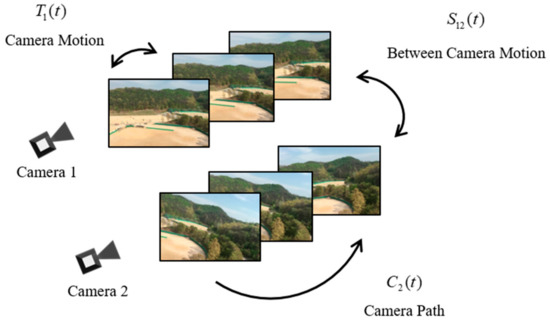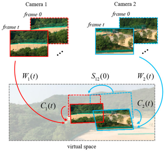 However, the BC is not used for a transformation of the coordinates between the frames. Because the references of frames are changed dramatically, the motion of the transformed frames may become more dramatic. Thus, the reference is set as the first frame for obtaining the stable results that seem to be taken with a fixed camera. For this work, we need warping motions (WMs) that transform the matrixes for mapping from the frames to the reference of the first frame. We denote WM as , with camera at the frame . The WMs are composed of the CPs and the initial BC. Figure 4 demonstrates the relationship among the WMs, CPs, and BCs. In the top of Figure 4, the red boxes are the inputs of the camera 1, and the blue boxes are the inputs of camera 2. Boxes with a dotted line are the inputs at the first frame, and boxes with a solid line are the inputs for individual frames denoted by . In the bottom of Figure 4, each input is transformed by the WM on the basis of the first frame of camera 1. The equation representing the WM can be written as