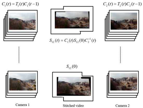 Though video stitching using CPs has acceptable performance, this approach has two problems. First, this method requires excessive processing time. The above two methods cannot be used for processing in a real-time system, because a conventional PC takes 3–4 s to stitch two frames for a video with a resolution of 1280 × 720 pixels. Second, misalignments are observed by successive compounding errors. The stitching method using CPs estimates the between-camera (BC) homography through the products of the initial BC homography and CPs. Therefore, in case that the errors of CPs occur, the misaligned artifacts are included in the results.