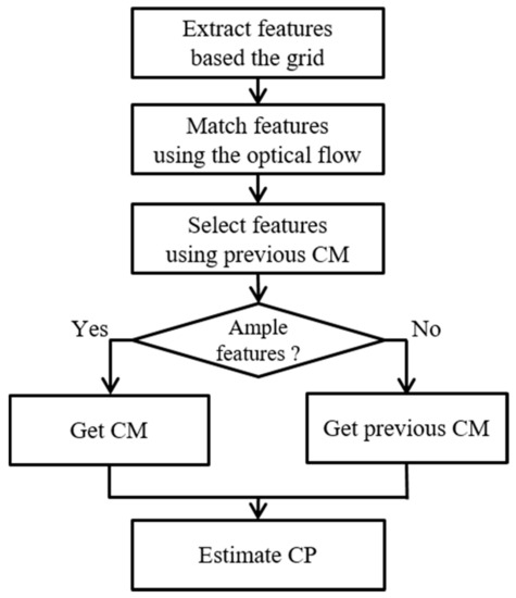 The feature selection protects against two unwanted situations: (1) different distributions of features are compared with the previous frame, and (2) no feature points are identified. First, the distribution of features is sometimes different from that of the previous frame. This situation produces the discontinuous result. For solving this problem, it is supposed that there is little difference between the current and previous CMs. Using this supposition, we transform the current features using the previous CM. Then, we calculate the Euclidean distances between the features transformed by the previous CM and the features tracked using the optical flow method. The distance is checked for whether it is smaller than a threshold. The features with distances smaller than a threshold are regarded as the inliers. Finally, the CMs are estimated by the inliers using RANSAC, and are multiplied by the previous CP to estimate the new CP. The method is defined as
