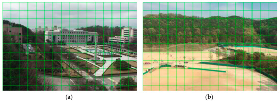 The feature extraction process, based on the grid, is made up of two steps: (1) frame division for a uniform distribution of features, and (2) feature extraction using the intensity of difference between adjacent frames. First, we divide the frames of input into a grid. Figure 7 show the inputs which are divided into a grid. The green lines are the lines of grid. The grid size is empirically set to 70 at the HD resolution (1280 × 720 pixels). The vertexes of a grid become potential features for extracting the features. After dividing an image into a grid, we select the features in the candidates on the vertexes of the grid. Second, the extraction method uses the difference of the intensity between the current and previous frames: