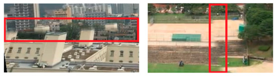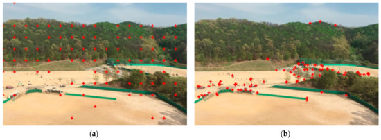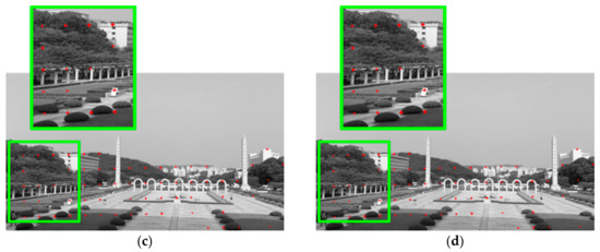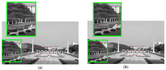 Finally, we estimate the threshold value to analysis the results of experiments with change in value of . In the Figure 20, we can compare with the results using (7) in the green boxes. The red crosses indicate the selected features, and the magenta crosses indicate the unselected features that are insufficient to be selected for estimation of homography. In the Figure 20c,d, the selected features are over-selected, while the proper features are selected as shown in Figure 20a. Therefore, in the paper, the threshold is set to 30. However, it notes that the can be adaptively set according to movement of the cameras. In the case that the movement of cameras is dynamic, is set to a higher value than the optimal value of 30.