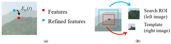 To update the refined BCs, the error motion should be estimated using the features and the refined features, which are the ideal features for stitching, as shown in Figure 10a. In other words, the locations of the refined features are found. The simplest method for finding the refined features is the method using SIFT and FLANN. However, this method is not suitable for a real-time system, due to the long processing time. Therefore, we estimate the error motion using block matching. The block matching is a matching algorithm that finds locations of templates. To find refined features, a template is constructed around the features from the right frame and a search ROI, which is the search range for block matching, and is built on the left frame, as shown in Figure 10b. Then, the error motion is estimated by implementing the block matching algorithms.