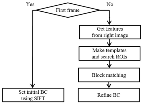 Figure 11 shows the flowchart of the homography refinement in detail. In the first step, we calculate the initial BC by using SIFT and FLANN at the first frame. Though this initial step has a long processing time, it is important to accurately estimate the initial BC, which is used as a reference for the refined BCs. In the second step, we reuse the features, which are obtained in the CP estimation, from the right frames, to construct the templates and search ROIs. In the third step, we form the templates of size ( × ) and search ROIs of size ( × ) around the warped features in the warped right and left frames, respectively. We define , as 9, 21, respectively. In the fourth step, we carry out the block matching to estimate the error motions. The block matching uses the normalized cross correlations (NCC) to measure the matching rate between the templates and search ROIs: