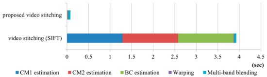 Table 1 shows the processing times using the six samples. On average, the proposed method spent 11.0 ms, 6.2 ms, 15.6 ms, 42.0 ms, for the camera path estimation, homography refinement, warp and blending, respectively. The total processing time is 75.6 ms (i.e., about 13.2 fps). In Figure 13, it is demonstrated that this method takes less time than video stitching using SIFT, which takes about 3.9 s. The proposed method approximately shortens the processing time by a factor of 50. This confirms that the proposed method is suitable for real-time systems.