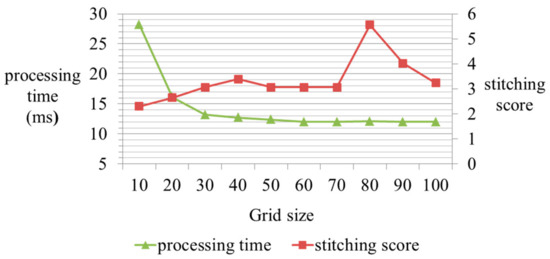 The size of the grid influences the number of features. The smaller the grid size, the more features are extracted. Figure 15 shows the stitching scores and processing times as a function of the changes in the grid size. We first measure processing time in the CP estimation step. We then calculate stitching scores without the homography refinement. In Figure 15, the processing time generally decreases by increasing the grid size. In detail, the grid sizes with 30 or more elements show no change in processing time. However, the stitching score is independent of the grid size, while a large grid size has a higher probability of leading to misalignments. On the whole, a high score is observed with large grid size. At the grid size of 80 elements, the highest score is obtained. Therefore, we consider the results of experiments to maintain a balance between the processing time and the stitching score. In this framework, we select grid sizes of 70 elements.