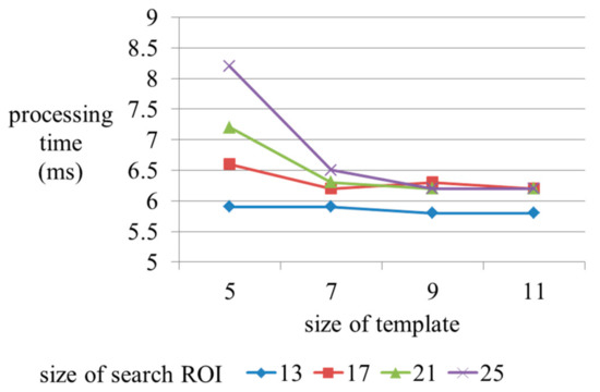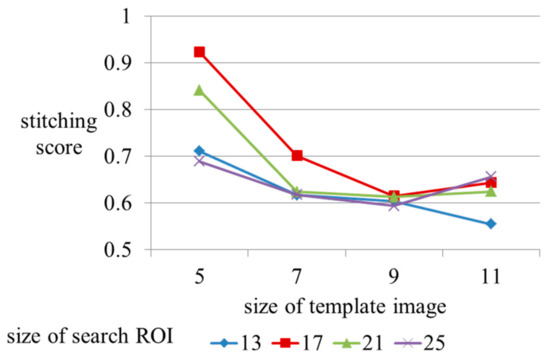 In the block matching process, the size of the template images and search ROI are important parameters relating to the computational complexities. Figure 16 and Figure 17 show the stitching scores and processing times as a function of changes in size of the template and the search ROI. We measure processing time during the homography refinement step. We calculate stitching scores after completion of the homography refinement. In Figure 16 and Figure 17, we confirm that the stitching score and the processing time gradually decrease with expansion of the template image, and are unrelated to the size of the search ROI. Figure 16 shows that the size of the template has little impact on the processing time, except for a size of 5. According to the results, we only consider the size of the template for the optimal parameter. But the large size of the search ROI is an important component. Inputs with fast movement require a wide search range. If a small size is set for the search ROI, inputs with fast camera movement are inappropriate for consideration. Therefore, we should consider an optimal search ROI. In the paper, we set the size of the template image and search ROI as 9 and 21.