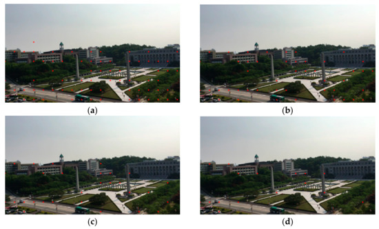 To set the appropriate value of threshold in the (5), both the number and position of features are considered. Figure 18 shows the results of experiments with a change in value of the threshold. The red crosses indicate the positions of the features. In the Figure 18a, some features are extracted on the poorly textured region like sky, causing the errors of optical flow. In the Figure 18c,d, although the features are extracted on the highly textured region, the number of features is insufficient for homography estimation. Therefore, an optimal threshold value is set to 5.