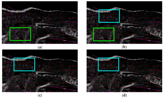 The value of threshold in (6) is also optimized by comparing the results of experiments. The role of threshold is to distinguish errors from the feature tracking. Therefore, when the optimal is set in (6), incorrect flows are classified as the false detection. Figure 19 is the results of experiments with change in the value of . Red lines indicate well-tracked features, and magenta lines indicate the errors. In the Figure 19a, the well-tracked features are recognized as the errors in a green box, unlike a green box in the Figure 19b. On the other hand, in the Figure 19c,d, the errors are missed in a cyan box. According to the results, the value of is set to 5.