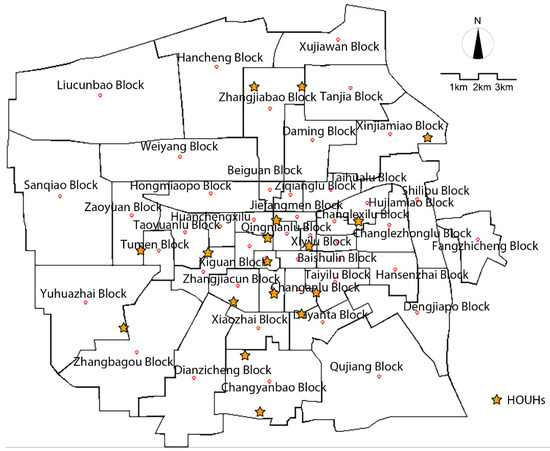 Xi’an is an important regional central city in Western China, and the capital of Shaanxi Province. Using the literature [23], the third ring road within the main urban area in Xi’an is chosen as the research area. When the selecting research units, some information that was needed, such as the address and the number of beds of 22 first-level hospitals in the research area, were obtained from the official website of Xi’an Municipal Health Bureau [24]. After removing some specialized hospitals that were not suitable for the elderly and merging the hospitals that were in close proximity to each other, the regional distribution of 17 HOUHs occurred as shown in Figure 1. On this basis, considering the availability of elderly population data, the 45 sub-district administrative divisions within the research area were taken as the basic research unit of accessibility analysis-blocks. The geometric center of each block was used to represent the most populated center of the block (Figure 1).