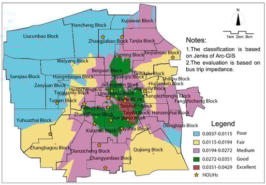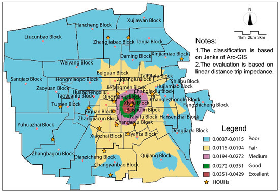 Under the condition that trip impedance is characterized by a straight-line distance, the common potential model reveals that the traffic accessibility of HOUHs in Xi’an is significantly attenuated from the center of the city. Research units with intermediate and higher accessibility levels in the inner urban area become smaller, and overall traffic accessibility of the peripheral urban research units is poor. However, the blocks in the southern part of the city have slightly higher accessibility.