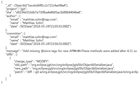 In a Git repository, a commit history is represented by a commit metadata involving change information of several files. A commit metadata consists of a SHA-1 (Secure Hash Algorithm) hash value, committed date, commit author, a commit message and diff information. The SHA-1 hash value is an identifier for distinguishing between commits. The diff information represents several pieces of change information for changed files such as change type, previous path, new path, and textual content of changed code. Figure 2 shows an example of commit metadata represented by JSON (JavaScript Object Notation) format.