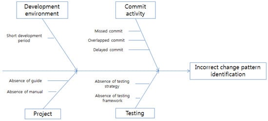 We summarized the root-causes of the incorrect change pattern identification. Figure 4 shows the four types of categories of the root-causes, such as Development environment, Project, Testing and Commit activity. ‘Short development period’ categorized in ‘Development environment’ is a major cause of lacking commit history to identify change patterns. ‘Absence of guide’ and ‘Absence of manual’ categorized in ‘Project’ may cause mistakes of developers in committing. The mistakes may be major causes on ‘Missed commit’, ‘Overlapped commit’, and ‘Delayed commit’. ‘Absence of testing strategy’ and ‘Absence of testing framework’ may also affect the quality of commit history.