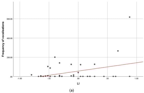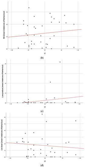 Regression between laterality index (LI) and vocalising (a), sitting (b), showing a low posture (c), and lying down behaviour (d). LI = −1 strong right-pawed bias; LI = 1 strong left-pawed bias.