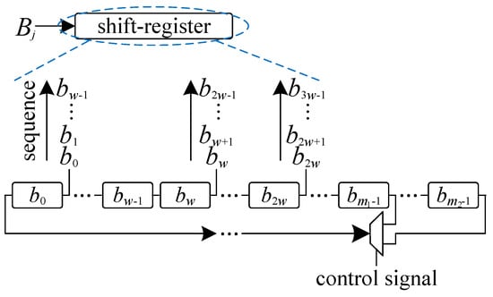 The two inputs, i.e., and , must be properly arranged to meet the data dependence requirement for hybrid-size operation. For , according to Algorithm 1, all bits are delivered in a grouped-sequential way, which can be realized by the structure, as shown in Figure 2. One can see that the shift-register is producing the required output bits to each PE of Figure 1 based on Algorithm 1, while the hybrid-size selection is done by the inserting of an extra MUX (MUX is short for multiplexer) in the shifting path such that the shift-register can be working under the field-size of either or through the proper control of the MUX (control signal).