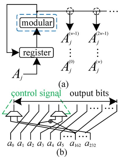 Besides that, one has to note that the National Institute of Standards and Technology (NIST) has recommended five irreducible polynomials for ECC implementation [,] (three pentanomials and two trinomials). Without loss of generality, we can assume is a pentanomial and is a trinomial. The corresponding structure presented below is also based on this assumption.
