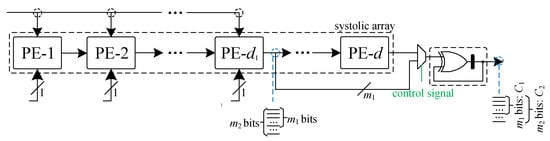 One can also notice that, according to Equations (9), (13), and (14), with the help of a modular operation (done by the modular cell in Figure 3), the PE-0 delivers the corresponding output to each PE, i.e., obtaining from (for ), which needs a delay time of ( is the delay time of an XOR gate, and it takes for trinomial-based multiplier and for pentanomial-based one []). Besides that, one has to note that all the in one specific can be obtained through the sharing of identical bits, as represented by the selective connection in Figure 1 and Figure 3. Following this arrangement, the proposed hybrid-size structure operates in an ordered form according to Algorithm 1.
