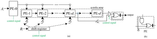 The operand , through the help of PE-0, delivers the correct output bits to each PE according to Algorithm 1, which requires a more sophisticated structure, as shown in Figure 3a. From Equations (13) and (14), one can observe that there are one XOR gate involved when obtaining from (trinomial-based multiplication) while it requires three XOR gates when deriving from . Thus, according to the data dependence requirement of Algorithm 1, one can find that there are d number of operands being delivered from PE-0 at the same cycle period, i.e., . These operands, in fact, involve multiple identical bits between each other and thus can be shared. For simplicity of discussion, let assume and , we can have (, , for , and for )