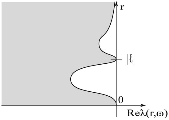 The proof of Theorem 7 tells us that the real part of some eigenvalue for (2) which comes from the dissipative Bresse system (36) contacts the imaginary axis at . Namely, we can expect that the real parts of the eigenvalues are located in the gray region in Figure 3.