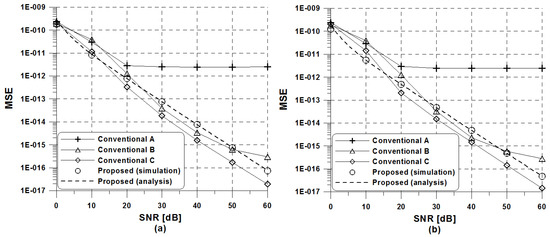 which says that in the presence of a typical values of is very small in comparison to [14]. Therefore, the first term of the LHS of Equation (32) can be omitted. With those implications in mind, we obtain the MSE from Equation (30)∼ Equation (32)