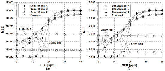 To make a fair comparison between the conventional and proposed frequency estimation schemes, the computational complexity is defined as as the number of real floating point operations (flops) used to perform one-shot estimation. For this purpose, we count a complex multiplication as six flops, whereas a complex addition as two flops [28]. At the receiver, the frequency-domain equalization (FEQ) used to obtain is assumed to be already executed so that the complexity of the conventional estimation schemes is analyzed in the case of known CSI. Calculating in Equation (3) for needs flops since QPSK modulation is used. Finally, two flops are additionally needed to acquire the SFO estimate in Equation (6). Thus, the total computational complexity used in the conventional estimation scheme A is . Meanwhile, the total number of flops used in the conventional schemes B and C are and , respectively. In the proposed approach, taking the frequential correlation in Equation (13) needs flops, whereas flops are additionally involved to compute the temporal correlation in Equation (17). In order to obtain block-wise partial correlation Equation (22), flops are needed, which is equal to . Lastly, flops are required to get the SFO estimate in Equation (23). The total number of flops of the proposed estimation scheme is counted as for each estimate.