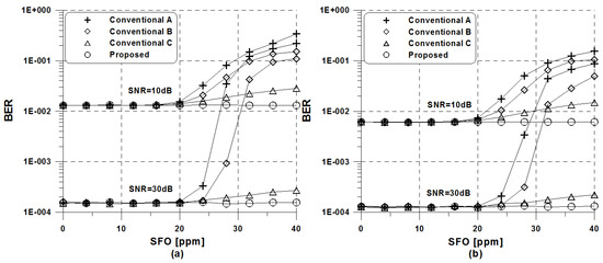 Bit error rate (BER) comparison between the proposed and conventional estimation schemes versus SFO: (a) High-speed ROBO mode (b) Standard ROBO mode.