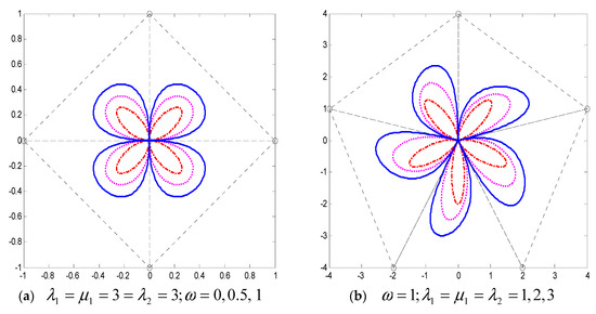 Figure 2 shows the SG-Bézier curves of degree 3. We know that SG-Bézier curves have local and global shape parameters by Definition 2. Figure 2a,b thus show the shape adjustment by modifying the global and local shape parameters, respectively. In Figure 2a, the global shape parameters are ω = 0 , 0.5 , 1 from outside to inside; while in Figure 2b, the local shape parameters are    λ 1 = μ 1 = λ 2 = 1 , 2 , 3 from outside to inside.