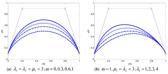 From the definition above, we can know that the SG-Bernstein basis functions in Equation (1) have n + 1 polynomials, each of which is of the degree n + 1. The basis functions defined by Equation (1) have n + 1 different shape parameters, which are ω , λ j , μ j , respectively. Specially, if n is even, the numbers of λ j and μ j are equal to n/2, respectively; while if n is odd, the number of λ j is equal to (n + 1)/2, and the number of μ j is equal to (n − 1)/2.