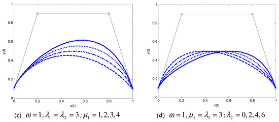 Figure 3 shows the SG-Bézier curves of degree 3 with different shape parameters. The corresponding shape parameters for the curves from the top to the bottom in Figure 3a are ω = 0 , 0.3 , 0.6 , 1 , respectively, where the shape parameters λ 1 , λ 2 and μ 1 are fixed. Fixing the shape parameters ω , λ 2 and λ 1 , the other shape parameters for the curves from the top to the bottom in Figure 3b are λ 1 = 1 , 2 , 3 , 4 , respectively. In Figure 3c, the shape parameters ω , λ 2 and λ 1 are fixed, and the other shape parameters for the curves from the top to the bottom are μ 1 = 1 , 2 , 3 , 4 , respectively. In Figure 3d, the corresponding shape parameters for the curves from the right to the left are λ 2 = 0 , 2 , 4 , 6 , while the other shape parameters ω , λ 1 and λ 1 are fixed.