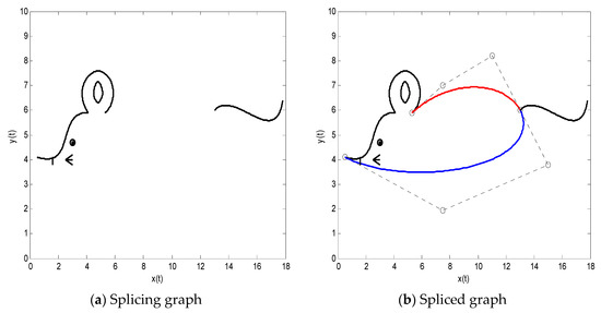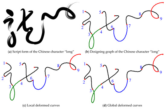 In order to demonstrate the approaches that can be applied to complex curve design, we will give two practical applications in this section. In computer graphics, the generation technology for different types of Chinese fonts has always been an important research topic. Figure 13 gives an example to design the curves for the script form of the Chinese character “long”, which means Chinese dragon. Figure 13a is a copy of the Chinese script of “long” drawn using the drawing software INKSCAPE. In Figure 13b, the graph of the Chinese character “long” is composed of nine SG-Bézier curves. Figure 13c,d shows the local and global deformation of the graph in Figure 13b by changing the shape parameters, respectively.