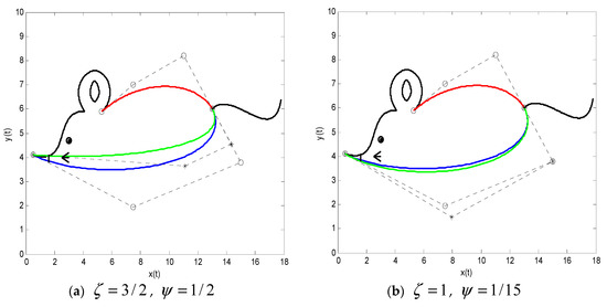 (2) The global shape of a composite curve can be altered by changing the parameters λ j , 1 ( j = 1 , 2 , , [ n / 2 ] + 1 ) (or μ j , 1 ( j = 3 , 4 , , [ n / 2 ] + 1 ) ) and λ j ˜ , 2 ( j ˜ = 3 , 4 , , [ m / 2 ] + 1 ) (or μ j ˜ , 2 ( j ˜ = 1 , 2 , , [ m / 2 ] + 1 ) ) simultaneously. Moreover, if only the G2smooth continuity remains unchanged, we can modify the global shape of the composite curve by altering the following shape parameters and control points: