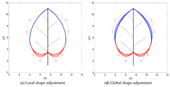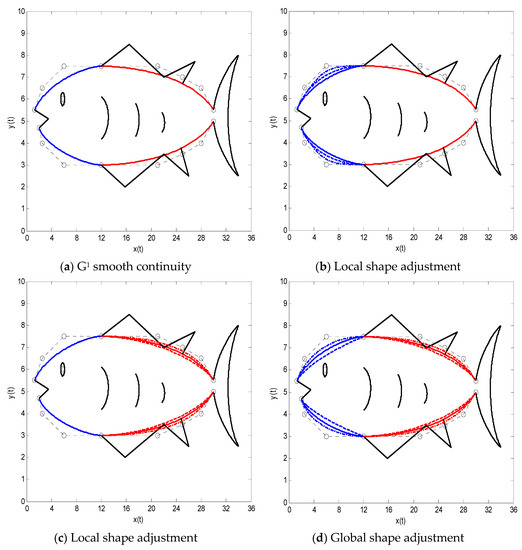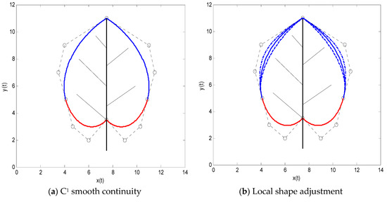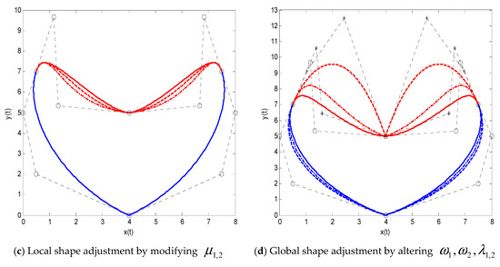 As the conditions in Equation (27) involve the global shape parameters ω 1 , ω 2 and local shape parameters μ 1 , 1 , μ 2 , 1 , λ 1 , 2 , λ 2 , 2 , we merely change these shape parameters (apparently these parameters are not included in smooth continuity conditions) to adjust the shape of the composite curve while keeping the control points and C2 smooth continuity the same. Now, we only adjust the local shape of the composite curve. So, we cannot modify the global shape only by altering the shape parameters. As ω 1 and ω 2 are the global shape parameters, we might alter the two control points P 1 2 and P 2 2 simultaneously to ensure that C2 smooth continuity is unchanged once we adjust the global shape by changing ω 1 and ω 2 . Similarly, as the C2 smooth continuity conditions involve the parameters ω 1 , ω 2 , μ 1 , 1 , μ 2 , 1 , λ 1 , 2 and λ 2 , 2 , we can adjust the global shape of the two parts that go beyond the splicing curve by modifying the shape parameters ω 1 , μ 1 , 1 , μ 2 , 1 and ω 2 , λ 1 , 2 , λ 2 , 2 , as well as the two control points P 1 2 and P 2 2 to ensure that the C2 smooth continuity is unchanged. Obviously, the global shape adjustment can be achieved by modifying the shape parameters ω 1 , λ j , 1 , μ j , 1 ( j = 1 , 2 , , [ n / 2 ] + 1 ) , ω 2 , λ j ˜ , 2 , μ j ˜ , 2 ( j ˜ = 1 , 2 , , [ m / 2 ] + 1 ) , and the control points P 1 2 and P 2 2 . Thus, conclusion (2) is proved. This completes the proof of Proposition 3.