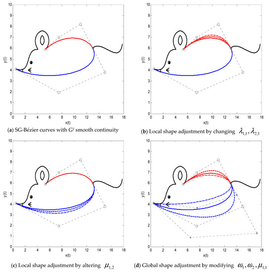 Figure 11 gives an example to show the C2 smooth continuity between two SG-Bézier curves of degree 3. In this figure, the blue curve is the given SG-Bézier curve, and the red curve is constructed by the continuity conditions in Equation (27), which together with the blue curve reaches C2 smooth continuity. The solid lines denote the curves before adjustment, while the dashed lines and dotted lines denote the curves after the adjustment of the shape parameters. The circular points denote the points before adjustment, and the asterisks indicate the modified control points. The shape parameters in Figure 11a are ω 1 = 1 , λ 1 , 1 = 2 , μ 1 , 1 = 2 , λ 2 , 1 = 3 and ω 2 = 0.5 , λ 1 , 2 = 4 , μ 1 , 2 = 4 , λ 2 , 2 = 3 . Figure 11b displays the global shape adjustment of the composite curve by altering the shape parameters λ 1 , 1 , λ 2 , 1 , where the shape parameters for the solid lines, dashed lines, and dotted lines are λ 1 , 1 = 2 , λ 2 , 1 = 3 , λ 1 , 1 = 0 , λ 2 , 1 = 0 , and λ 1 , 1 = 4 , λ 2 , 1 = 6 , respectively. Figure 11c displays the local shape adjustment by using a single shape parameter μ 1 , 2 , where the shape parameters are μ 1 , 2 = 4 (solid lines), μ 1 , 2 = 2 (dashed lines), and μ 1 , 2 = 0 (dotted lines), respectively. Based on Figure 11a, Figure 11d illustrates the global shape adjustment by modifying the shape parameters ω 1 , ω 2 , λ 1 , 2 . From the figure, we realize the global shape adjustment for the dashed lines merely using the shape parameters ω 1 , ω 2 (with ω 1 = ω 2 = 0.1 ), and the dotted lines by changing shape parameters ω 1 , ω 2 , λ 1 , 2 (with ω 1 = 0.5 , ω 2 = 0.8 , λ 1 , 2 = 3 ) . The rest of the shape parameters are equal to those in Figure 11a expect for the ones that are modified in the other three figures.