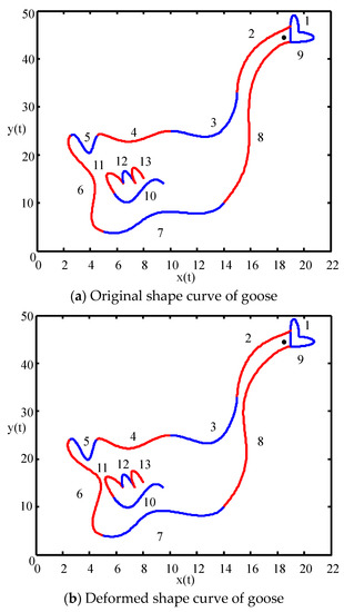 Figure 14 displays an example to design the curve graph of a goose by using SG-Bézier curves. In this figure, the shape curves are composed of 13 SG-Bézier curves with different shape parameters.