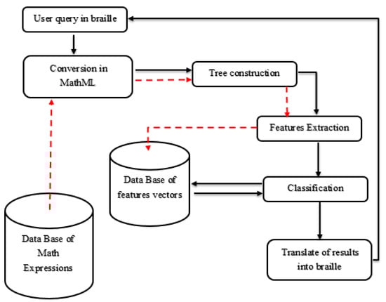 In online mode, the user launches a request equation in braille code. The request is firstly pretreated in MathML using a presentation markup that analyzes it semantically and then, based on that, builds the tree substructure of the request and the extraction of characteristics in the form of the features vectors. Finally, there is the classification of similar vectors to the request in the database. The results of the classification are converted into braille and presented to the user. We explain in detail the various phases of the system in the following sections.