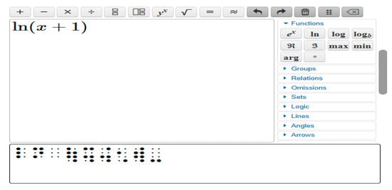 P. B. Stanley et al. [] presented an assistive software application for people with visual impairments to use mathematics. All mathematics converted into MathML is translated into Nemeth Braille Code (NBC) [], and the latter can be directly transferred to a refreshable braille device, downloaded into a braille device, and embossed by a third-party application [,].