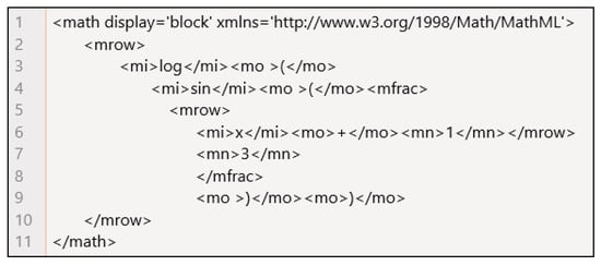 In our system, we use presentation MathML to code the semantic and notational structure of mathematical equations (Figure 3). This formula representation is marked and limited by two markups, <math> and </math>.