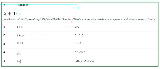 A. Salamonczyk and J. B. Pawlowska [] presented a novel approach to the problem of semantic translation of mathematical expressions to Polish text. To overcome this problem, they used MathML to help and allow blind Polish people to read online documents containing mathematics.