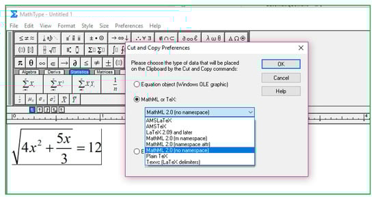 We created a data system composed of mathematical expressions to evaluate the efficiency of the suggested system. All of the data are constructed using MathType, an interactive tool for the creation of mathematical material found in Microsoft Word and PowerPoint under the MathType Rubin tab to facilitate editing, inserting, and creating mathematical equations. The game elements of the dataset can be easily converted into MathML or LaTeX (Figure 8).