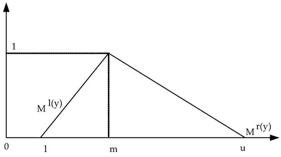Saaty [] proposed a FANP model. The triangular fuzzy number (TFN) can be determined as (a, b, c) with a ≤ b ≤ c. In this research, sites selection were made based on TNF, so this fuzzy number was studied [,,,,]. A TFN is shown in Figure 2.