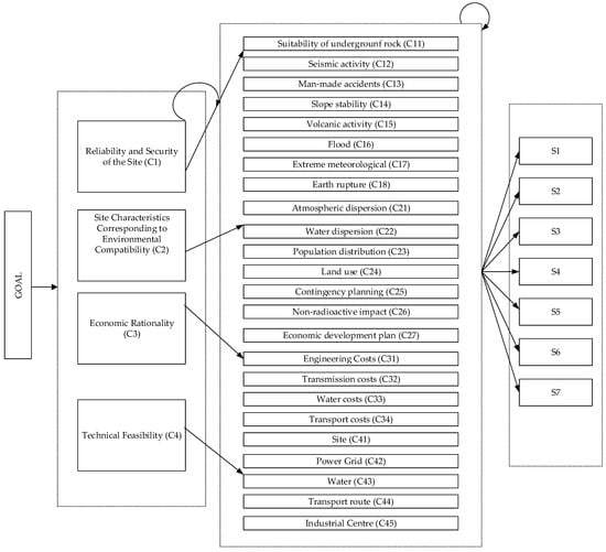 The main aim of this work is to study in detail the location selection in NPP construction. In this process of site selection for building an NPP in Vietnam, the main factors are discussed based on the regulations for environmental radiation protection of a nuclear power plant [] and some previous works [,,,,]: Reliability and Security of the Site (C1), Site Characteristics Corresponding to Environmental Compatibility (C2), Economic Rationality (C3), and Technical Feasibility (C4). The hierarchical structures of the FANP model are shown in Figure 4.