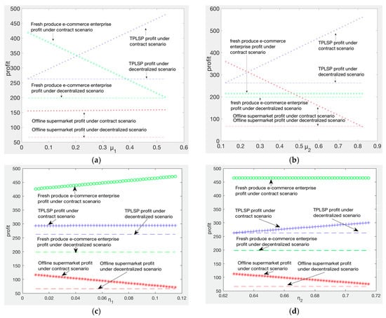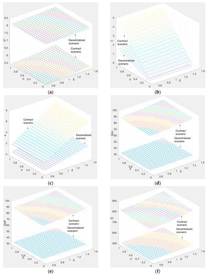 Proposition 6 indicates that, under the above conditions of contract parameters, the unit, dual-channel selling price, the greenness degree, and the freshness-keeping effort of the dual-channel, three-layered green supply chain are coordinated and the profit has reached the maximum. This reveals that, although the centralized supply chain mode is difficult to realize, the decentralized decision-making supply chain can achieve the performance and efficiency of the centralized scenario, through the JR&CS contract. From the JR&CS contract, we can find that if the fresh-produce e-commerce enterprise and the offline supermarket jointly share more revenue with the TPLSP, then the third party is willing to bear more freshness-keeping cost. At this point, because the fresh produce e-commerce enterprise shares more revenue with the TPLSP, its share of the green investment cost will be reduced. As the green investment cost shared by the fresh produce e-commerce enterprise decreases, the green investment cost shared by the offline supermarket will rise accordingly. However, as its profit shared with the TPLSP increases, its share of the freshness-keeping cost will decrease accordingly.
