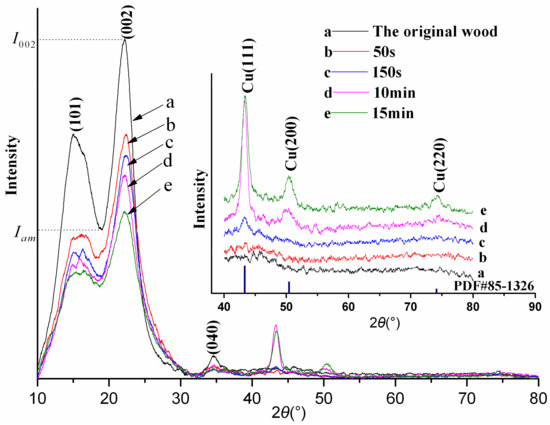 Relative crystallinity was calculated according to Formula 3 for calculating the crystallinity of wood cellulose. The crystallinity of the sample decreased by 5.3% when the sputtering time was 50 s, 1.7% for 150 s, 4.9% for 10 min, and 10.8% for 15 min. Compare the copper plating samples and the original samples, the crystallinity of the coating samples decreased and the change law was not obvious. However, sputtering over 15 min showed the greatest decrease in relative crystallinity. The cellulose molecular chains of the wood crystalline region are arranged tightly and orderly, the sealing agent and sputtering of copper atoms cannot enter the crystalline region, while the structure in the amorphous zone is loose. In the process of the wood veneer coating treatment, some of the copper atoms of sealing agent and sputtering enter into the nanovoid of wood and infiltrate into the amorphous area of the wood cell wall. With the increase in thickness of copper film, the quality of the amorphous area increases and the crystallinity of wood cellulose decreases [25].