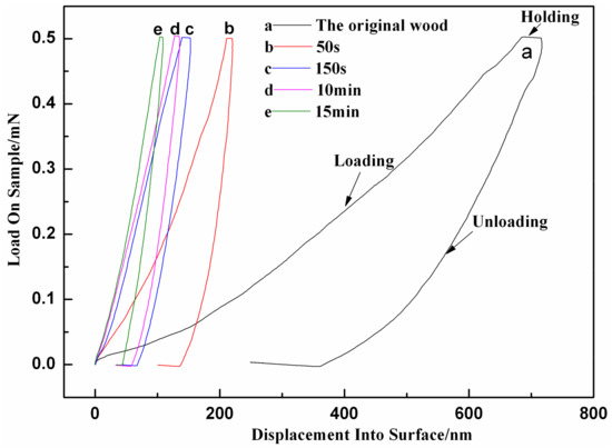 The load–compaction depth curve of wood veneer before and after metallization is shown in Figure 2. During the loading process, elastic deformation and plastic deformation occurred on the sample, resulting in the nonlinearity of the loading curve. The unloading curve reflects the elastic recovery process of the sample. The whole process consists of loading, holding, and unloading phases. It can be seen that the load-compression depth curve of the metallized wood veneer sample treated with magnetron sputtering on the surface is significantly shifted to the left compared with the original wood sample, the sample with sputtering time of 50 s is the smallest and the sample with sputtering time of 15 min is the largest. From the loading curve, the maximum load of the quasistatic constant rate loading and unloading mode was 0.5 mN and the loading time was 5 s. The loading displacement of the original wood was 684 nm, and of the sample coating 50 s was 210.9 nm, 139.1 nm for 150 s, 126.9 nm for 10 min, and 107.7 nm for 15 min. The loading displacement decreased by more than 80%. Therefore, when the thickness of the sputtering film is small, the load displacement of the sample decreases continuously with the increase of deposition time. The load–compaction depth curve of the sample reflects the change in load displacement of the metallized wood veneer with the increase of deposition time. As the coating time increases, the influence of the wood base effect and the porous structure of wood on the load–compaction depth curve become smaller, indicating that the measurement stability and repeatability become better.