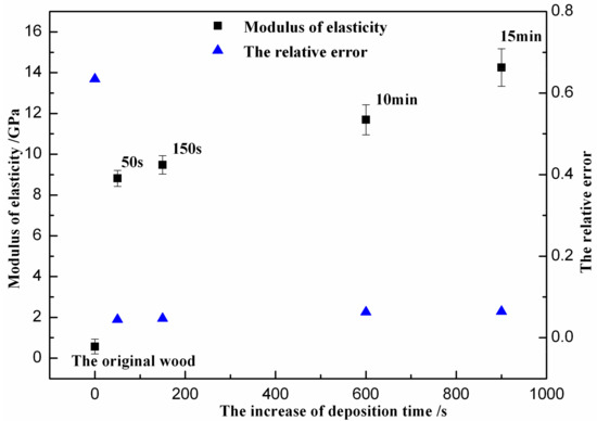 The change in the modulus of elasticity of the metallized wood veneer is shown in Figure 3: the modulus of elasticity of wood veneer metallization increases rapidly after metallization, and then growth tends to slow approximately linearly. The average modulus of elasticity of untreated wood is 0.57 GPa, and for 50 s coating was 8.81 GPa, which increased by 14.5 times; 9.48 GPa for 150 s, by 15.7 times; 11.7 GPa for 10 min, by 19.6 times; and 14.26 GPa for 15 min, by 24.1 times. As the modulus of elasticity of copper is much larger than that of wood, the growth of the copper film on the surface of wood veneer rapidly increased the modulus of elasticity of wood veneer.