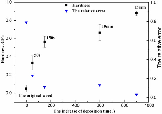 The change in hardness of the metallized wood veneer is shown in Figure 4. After metallization, the hardness of the wood veneer first increased rapidly and then tended to be slow. The average hardness of untreated raw wood was 0.0484 GPa, and of 50 s metallization was 0.3346 GPa, which increased by 6.0 times; 0.5654 GPa for 150 s, by 10.8 times; 0.6674 GPa for 10 min, by 12.9 times; and 0.8796 GPa for 15 min, by 17.3 times. As the hardness of copper is much larger than that of wood, the growth of the copper film on the surface of the wood veneer rapidly increased the hardness of wood veneer. With the increase of deposition time, the thickness of the copper film increased and the base effect of the wood veneer decreased. The hardness of the sample tends to the hardness of the copper sample itself.