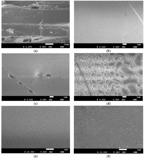 Metallized wood veneer scanning electron microscopy (SEM): (a) The original wood; (b) wood with sealed processing; (c) magnetron sputtering for 50 s; (d) magnetron sputtering for 150 s; (e) magnetron sputtering for 10 min; and (f) magnetron sputtering for 15 min.