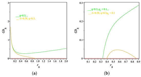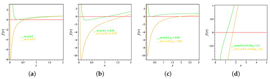 The calculations of the horizons, of the Maxwell electrodynamics cases given by Equations (22) and (28) and the non-linear electrodynamics cases given by Equations (42) and (48), are carried out by finding the roots of the unknown function which can be seen for specific values of the parameters which characterized the model. The plots of Figure 1 show that the two roots of which determine the black hole are the inner and the cosmological horizons. It is of interest to note that, for solutions (22), (28), when , and , one can show that the two roots are possible when for solution (22), for solution (28) and for the non-linear case for solution (42). The most interesting thing is when , or and one can determine the degenerate horizons at which , which is the Nariai black hole. When or , there is no black hole formulation.